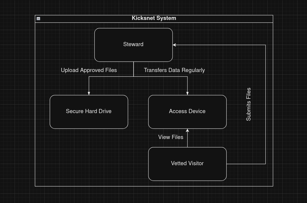 While Sneakernet is regarded as secure in its resistance to common network-based attacks (i.e. packet sniffing, man-in-the-middle), there are still vulnerabilities observed by computing scholars. Namely, sneakernet is still liable to breaches in confidentiality and integrity, as the physical transfer of data might still require intermediaries. It also suffers from unpredictable latency due to the volatility of physical transport. Thus there is a need for an added layer of trust, encryption, and timely handshakes at the human and software level. Kicksnet seeks to address these vulnerabilities by updating sneakernet with core standards that foster trust at both a human and software level.