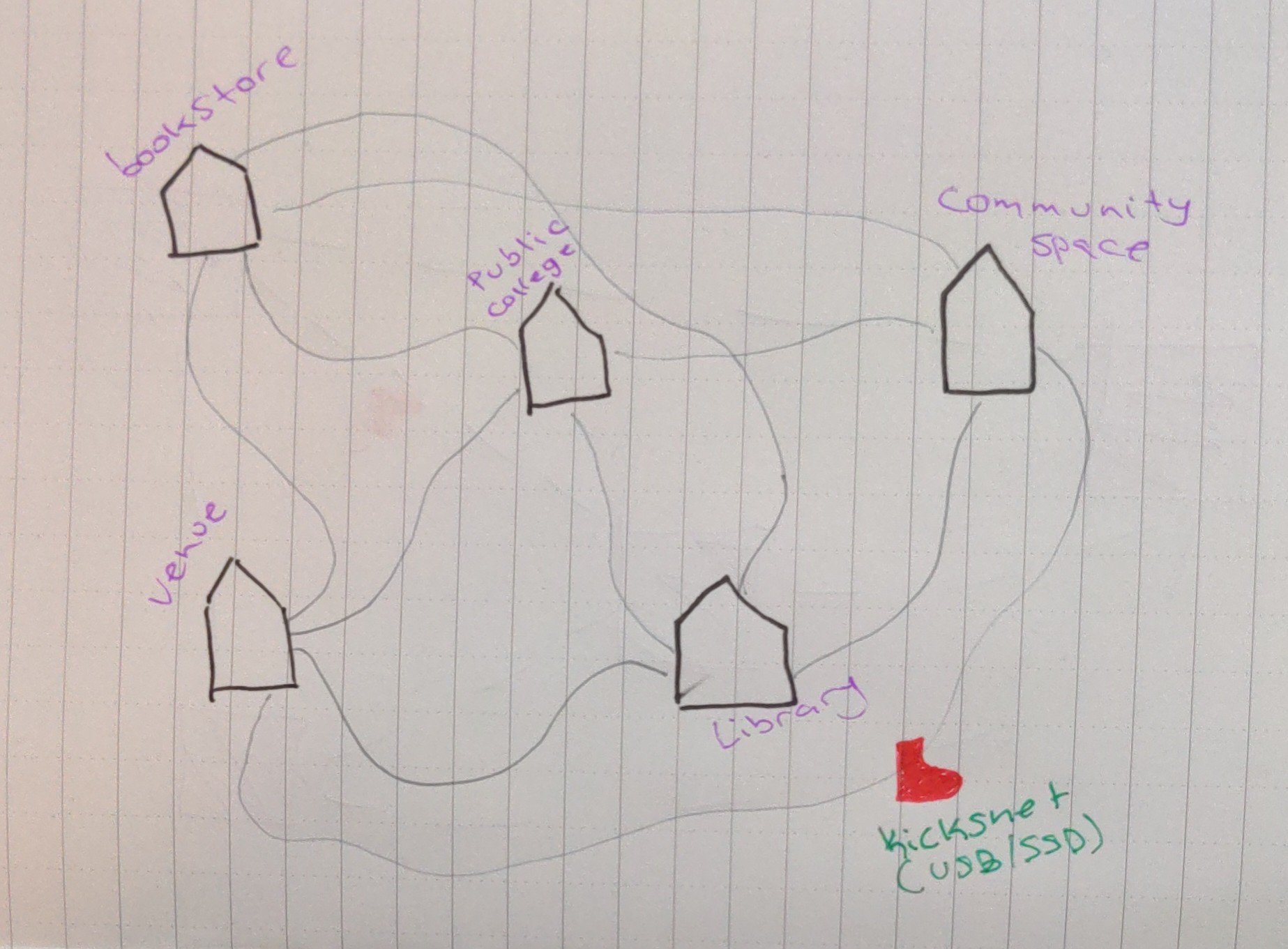 Well Kicksnet is a Sneakernet with a few intentional features that make it more ideal for a specific use-case - sharing sensitive information among within vulnerable communities. By setting up trusted, physical access points for sensitive data within local community spaces, equipping data carriers with secure, customizable tools for moderation, and sustaining the network over a clear and open community guidelines document, Kicksnet aims to be a mode of knowledge sharing that is by and for the people who use it, paticularly those most targeted by over-surveillance and censorship risks.